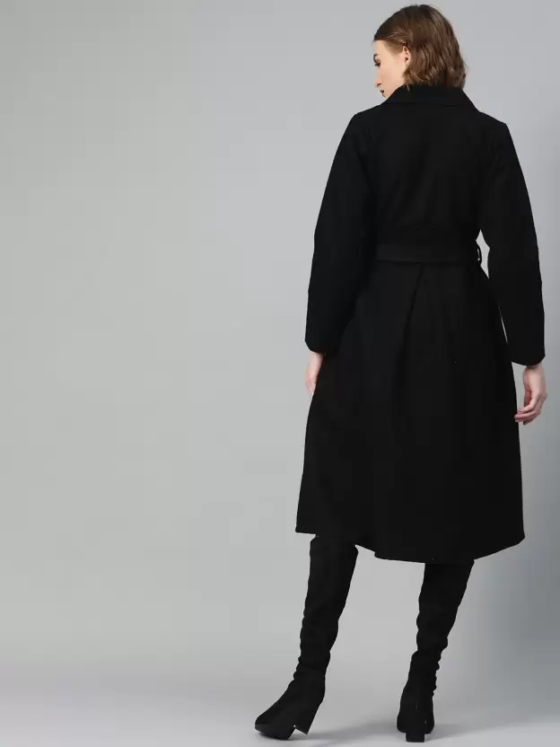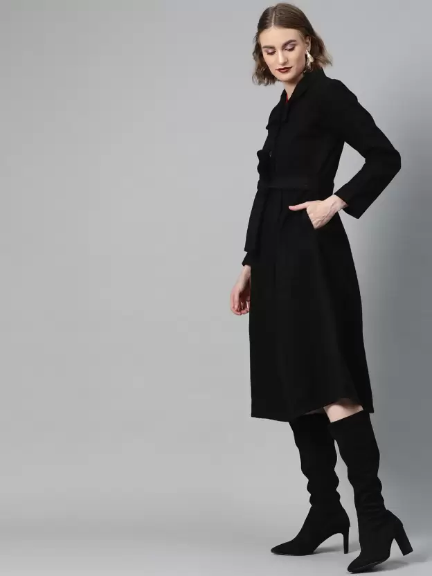 Athena black fit & flare box pleated single breasted button calf length full regular sleeve dress.