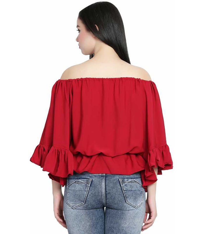 Casual Ruffled Sleeve Solid Women Maroon Top